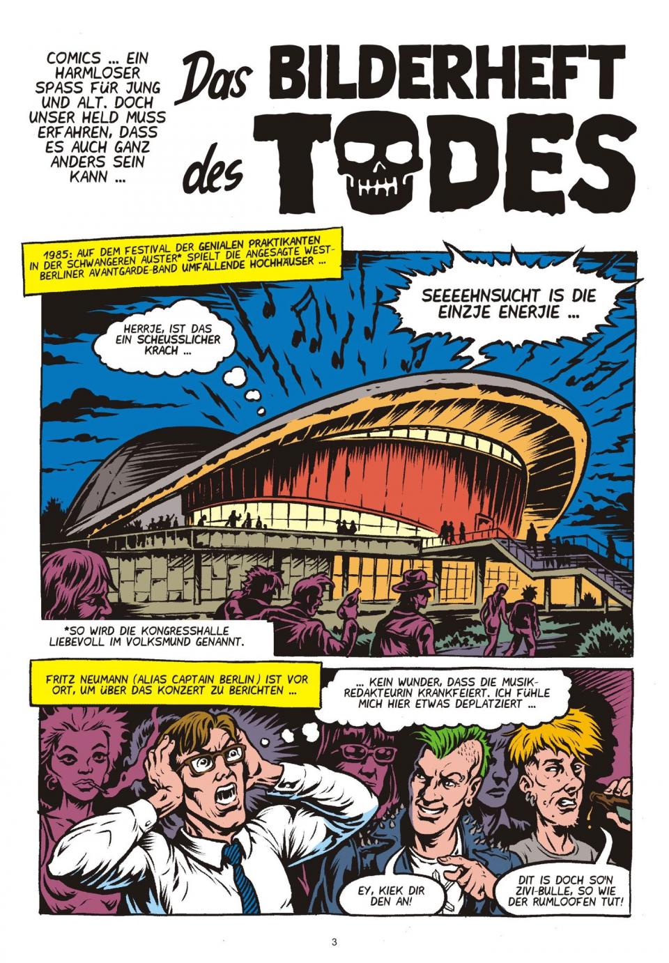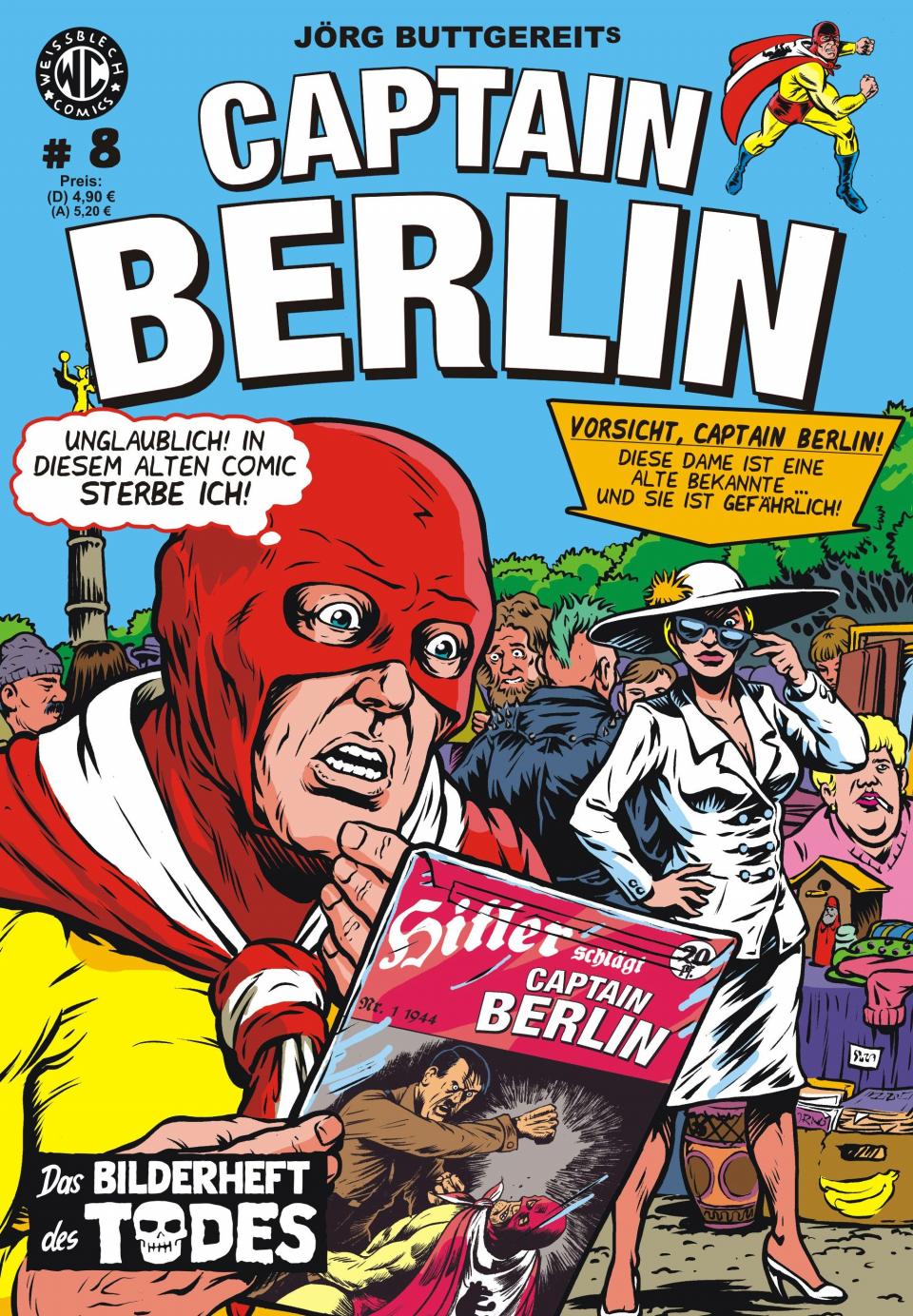 Diesmal im Heft: Das Bilderheft des Todes! Ganz recht, durch blanken Zufall gerät Captain Berlin auf die Spur eines rätselhaften alten Comicheftes, auf dessen Seiten er seinen eigenen Tod sieht! Dahinter verbirgt sich allerdings ein weit größeres Geheimnis, das auch bald schon Captain Berlins grausamste Gegnerin auf den Plan ruft. Alte Feinde und neue Helden erwarten den Rächer der Hauptstadt in dieser furiosen Story! Als Zusatzgeschichte gibt es noch einen heimligen Blick über die mechanischen Schultern des elektronischen Gehilfen: Lest Ein Tag mit A-100 und staunt über den findigen Burschen!