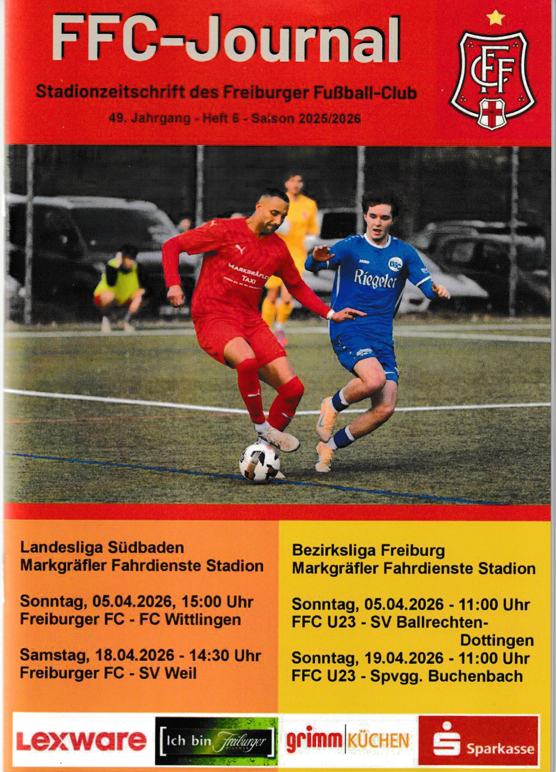 Das Freiburger FC "FFC Journal" Heft Nummer 6 wurde erstmals am 05.04.2026 beim Heimspiel gegen den FC Wittlingen verteilt. Format A5, Hochglanz, vollfarbig. Das Heft erscheint monatlich und befindet sich nun schon im 49. Jahrgang. Abs sofort mit dickeren Umfang und etlichen Spielberichten.