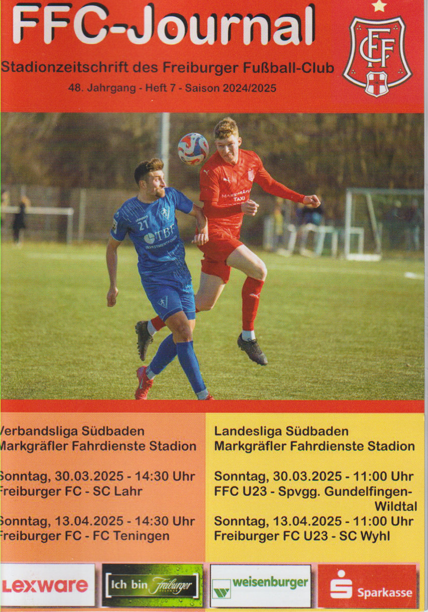 Das Freiburger FC "FFC Journal" Heft Nummer 6 wurde erstmals am 30.03.2025 beim Heimspiel gegen den SC Lahr verteilt. Format A5, Hochglanz, vollfarbig. Das Heft erscheint monatlich und befindet sich nun schon im 48. Jahrgang.