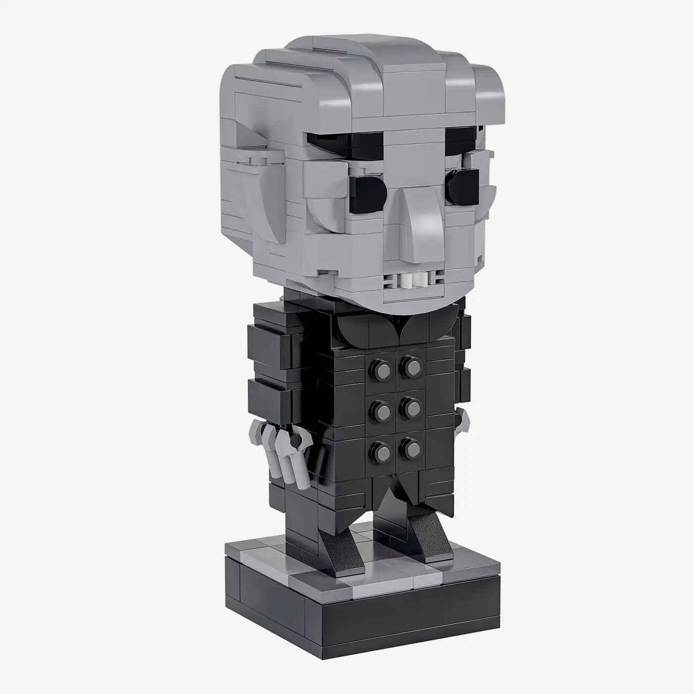 Mit dem Nosferatu hält der Schrecken der Stummfilm-Ära Einzug in deine Klemmbausteinwelt! Diese unheimlich charmante Figur ist eine Hommage an den legendären Vampir aus den frühen Tagen des Kinos – bleich, geheimnisvoll und mit einem Blick, der dir das Blut in den Adern gefrieren lässt.