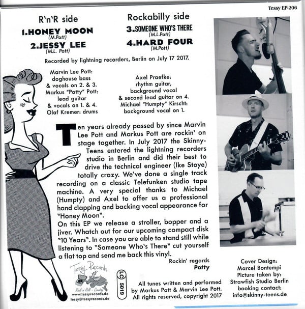 Two midtempo Rockabilly & two Stroller, recorded at Lightning Recorders, Berlin. Sleeve Design by Marcel Bontempi, 500 limited not numbered copies.
